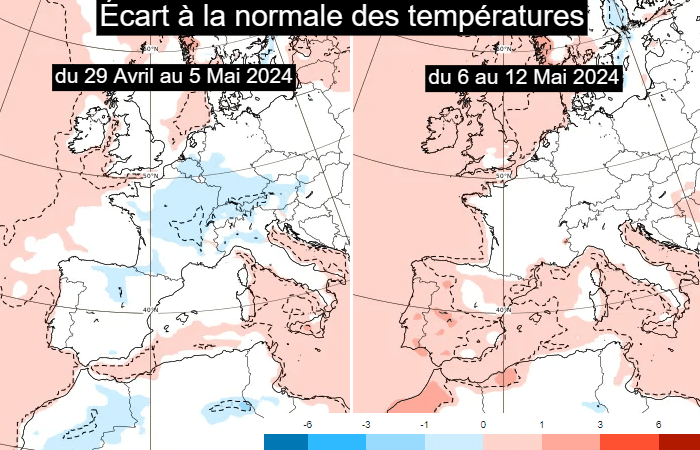 Écart à la normale des températures du 29 avril au 5 mai et du 6 au 12 mai 2024 - via ECMWF