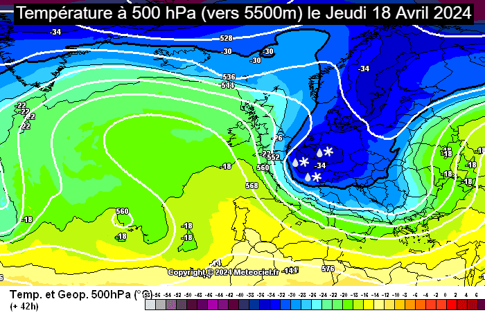 Températures à 500 hPa (vers 5500 mètres) ce jeudi 18 avril 2024 - via meteociel.fr
