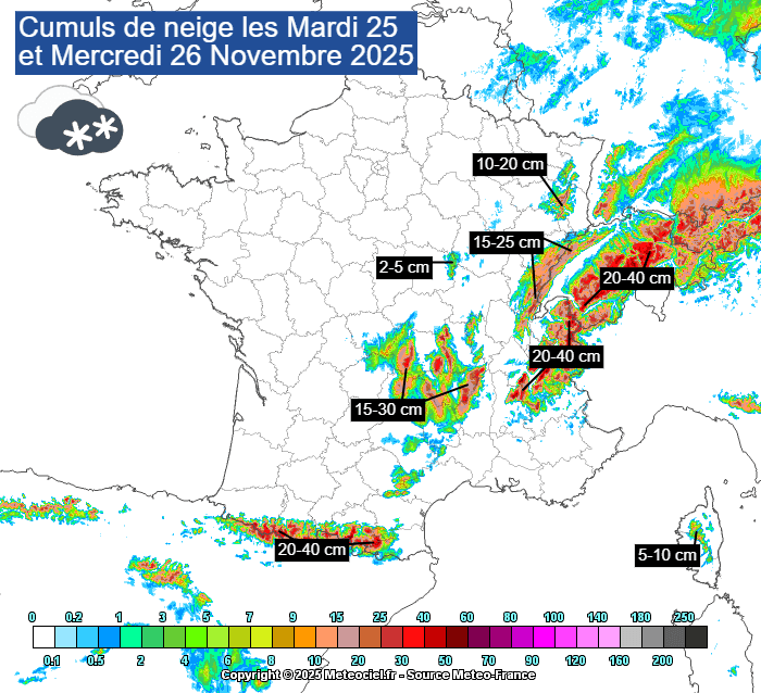 Cumuls de neige prévus ces mardi 25 et mercredi 26 novembre 2025 - meteociel.fr