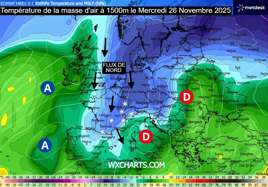 Les basses pressions se décalent entre l'Europe Centrale et l'Italie tandis que l'anticyclone se renforce sur le proche-Atlantique. Ainsi, le flux bascule au secteur nord-ouest à nord avec un nouvel afflux d'air froid ces mardi 25 et mercredi 26 novembre 2025. Ce dernier sera moins marqué que la semaine dernière mais les températures de la masse d'air vers 1500 mètres vont s'abaisser vers -5°C dans le nord-est de la France, autorisant des précipitations sous forme neigeuse dès les premières hauteurs.