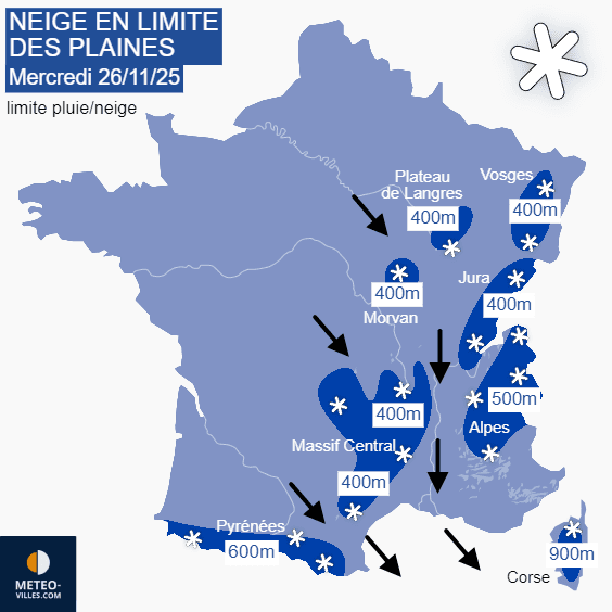 La limite pluie/neige s'abaisse déjà en basse montagne ce mardi 25 novembre 2025 et continuera de descendre jusqu'à ce mercredi 26 novembre 2025. Elle se situera alors aux alentours de 400 mètres seulement entre les Vosges, le Jura et le Massif Central, concernant aussi le Morvan et le plateau de Langres. Dans le nord des Alpes, la neige tombera à partir de 500 mètres et dès 600 mètres dans les Pyrénées. Le relief corse ne sera pas épargné avec des averses de neige dès 900 mètres.