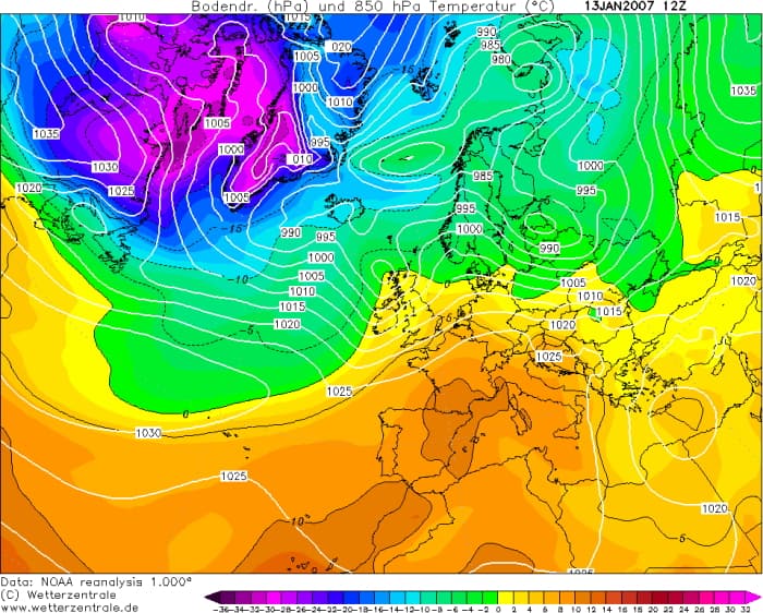 Réanalyse de la situation à échelle continentale le 13 janvier 2007 - via wetterzentrale.de