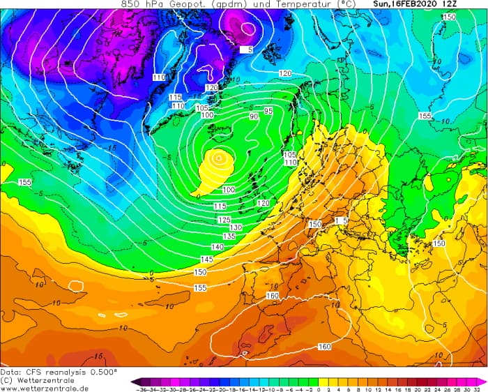 Réanalyse de la situation à échelle continentale le 16 février 2020 - via wetterzentrale.de
