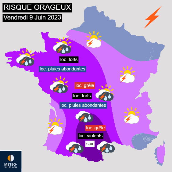 Risque orageux en France pour le vendredi 9 juin 2023 - Météo Villes