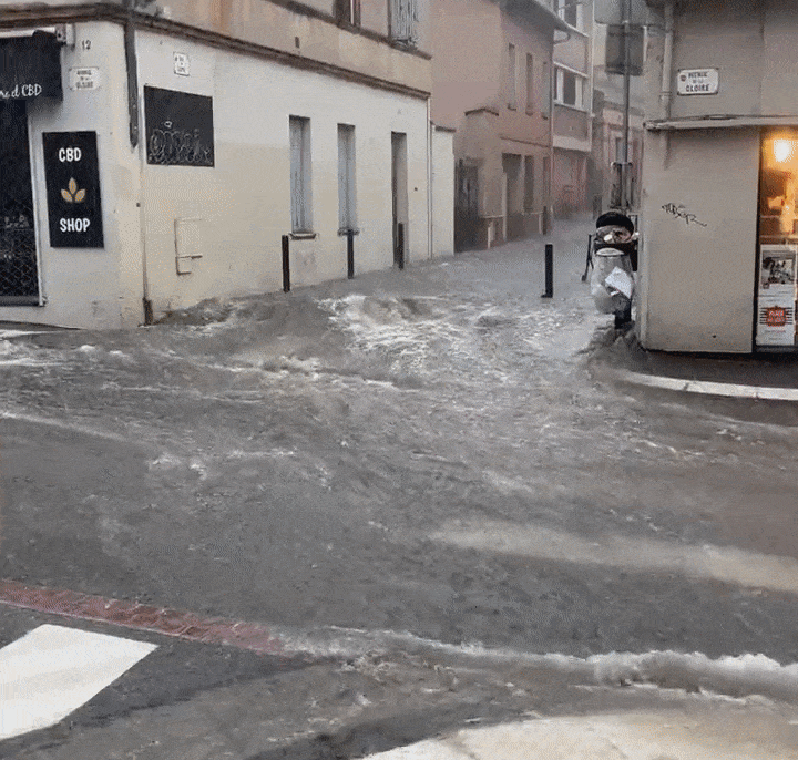 Ce dimanche 11 juin 2023, la ville de Toulouse a également subi un orage diluvien. Contrairement à celui de Paris, ce dernier a pris un caractère stationnaire en déversant de fortes pluies sur la ville rose et son agglomération durant une heure. Dans ce cas de figure, le cumul total de pluie vient s'ajouter aux intensités pluviométriques, constituant un facteur aggravant. Plusieurs dizaines de millimètres de précipitations peuvent tomber en l'espace d'une heure. Rapidement, le réseau d'assainissement sature et l'eau s'accumule dans les rues.