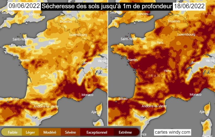 Modélisation de la sécheresse des sols (0-100cm) entre le 9 et le 18 juin 2022 - via windy.com