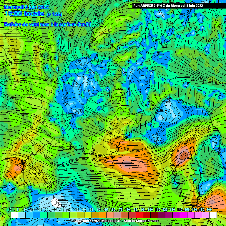 Rafales de vent au sud-est du mercredi 8 au samedi 11 juin 2022 - via meteociel.fr