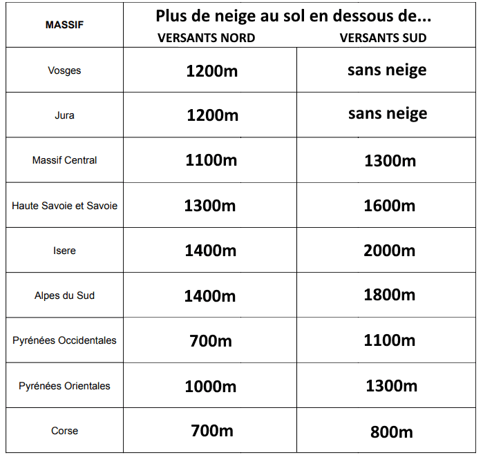Les Vosges et le Jura sont actuellement les plus mal loties en terme de présence du manteau neigeux. Sur les versants sud, il n'y a quasiment plus de trace de neige jusqu'aux altitudes les plus hautes. Sur les versants nord, les premières traces de neige se situent vers 1200 mètres. Les altitudes sont similaires sur le Massif Central. C'est encore pire dans les Alpes où il n'y a quasiment plus de neige en moyenne montagne. Les Pyrénées, quant à elles, ont bénéficié de chutes de neige à basse altitude fin février. Idem en Corse où la neige apparaît assez bas.