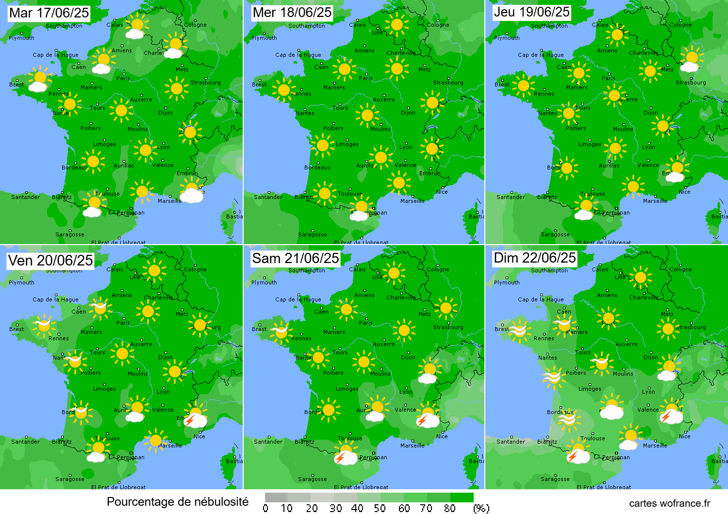 Pourcentage de nébulosité du mardi 17 au dimanche 22 juin 2025 - wofrance.fr