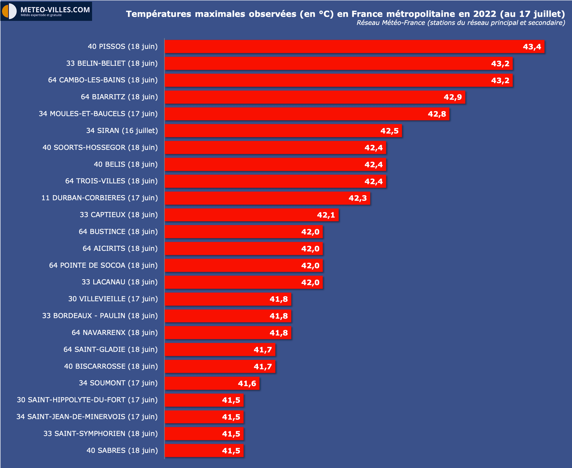 • 41.9°C à Belin-Beliet - Centre (33) : Record mensuel