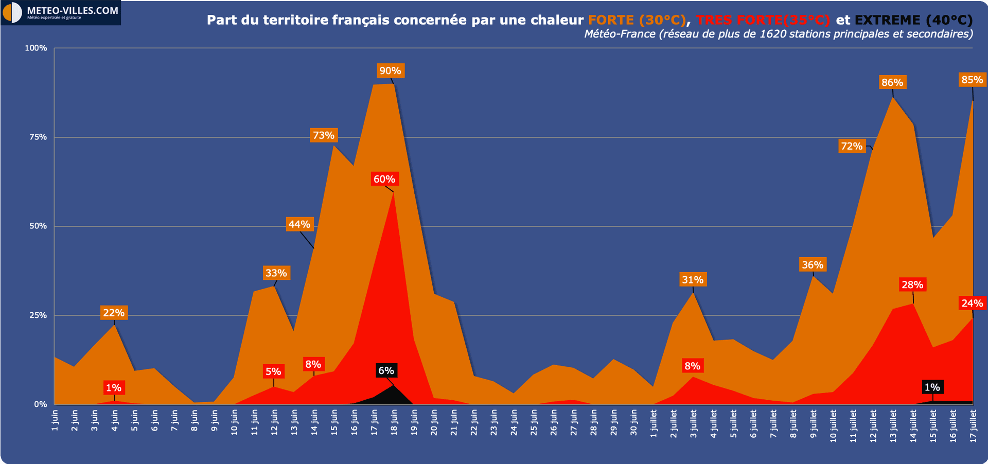 Part du territoire concernée par les seuils 30°C / 35°C / 40°C (au 17 juillet)