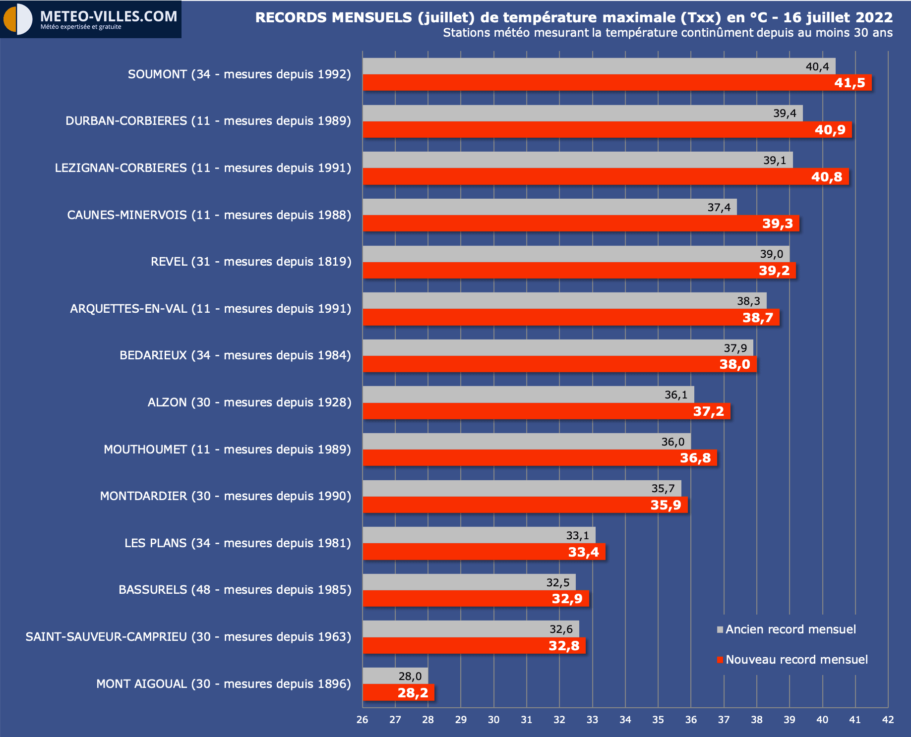 Face à de telles températures, ce sont de nouveaux records pour un mois de juillet qui ont été battus durant l'après-midi. Pour certaines villes de l'Hérault ou de l'Aude, l'ancien record mensuel a été battu pour la 2e fois voire même la 3e fois en quelques jours (Soumont, Arquettes-en-Val, Caunes-Minervois...).