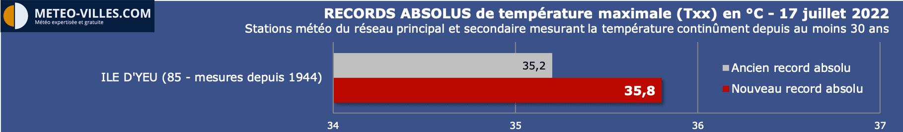 Un nouveau record absolu a été dépassé cet après-midi : il s'agit de l'Ile d'Yeu (Vendée) avec ses 35.8°C, et mesurant continuellement la température depuis 1944. Brest, avec ses 35.2°C a égalé son record absolu (mesures depuis 1945), avant de véritablement l'exploser sans aucun doute demain (plus de 40°C prévus).