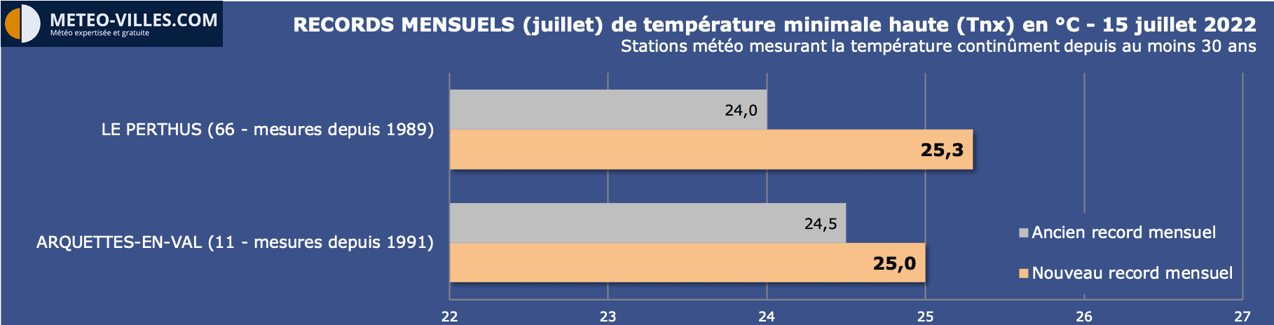 • 22.8°C à Peyrusse-Grande (32), battant les 22°C du 31 juillet 2020 (station ouverte en 1985)