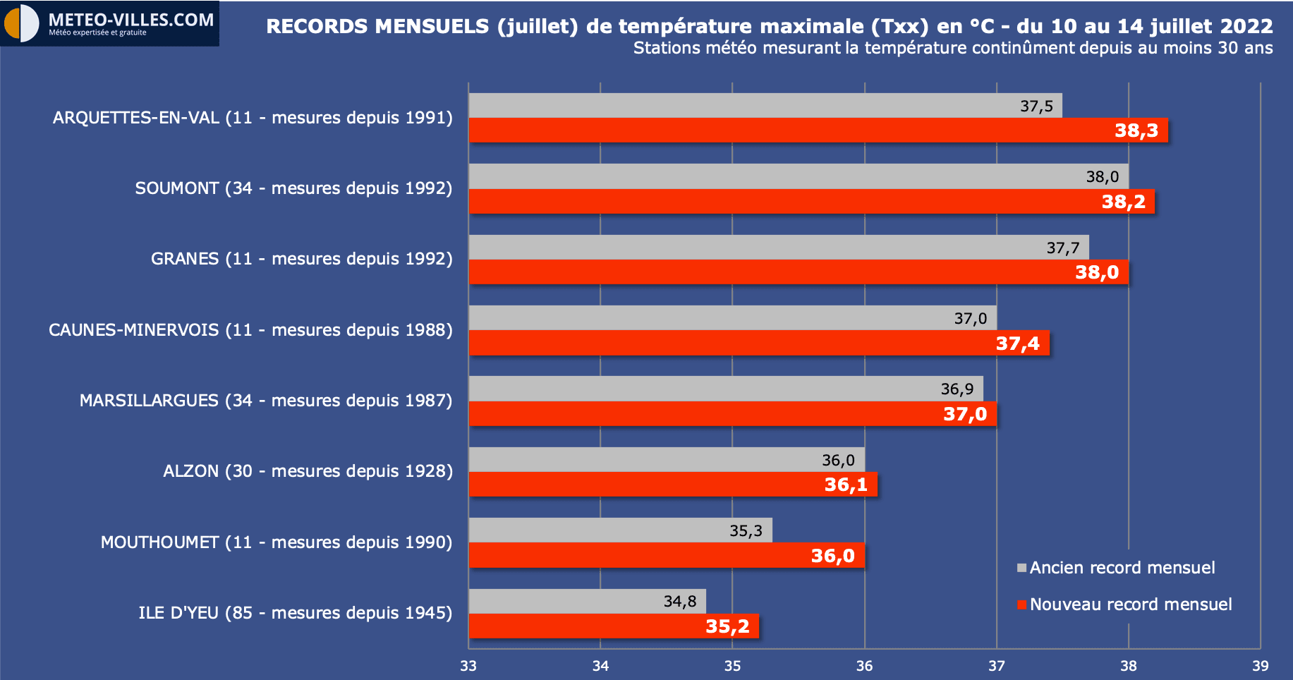 Parmi les stations mesurant depuis plus de 30 ans, 4 d'entre-elles ont encore battu leur record de chaleur pour un mois de juillet ce dimanche. Pour Revel (Haute-Garonne), il s'agit de la 2e journée consécutive : 39.6°C aujourd'hui, après les 39.2°C de samedi, contre un ancien record de 39.0°C (mesures depuis le 19e siècle).