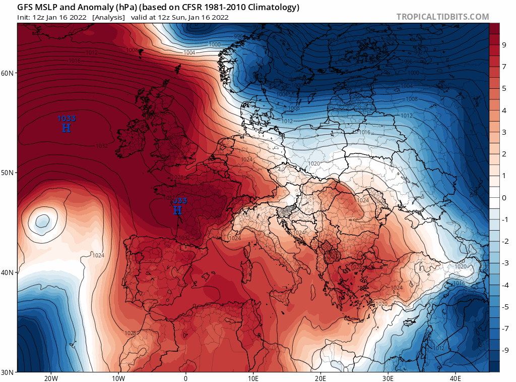 Animation de pressions en Europe du 16 au 23 janvier 2022 - via tropicaltidbits.com