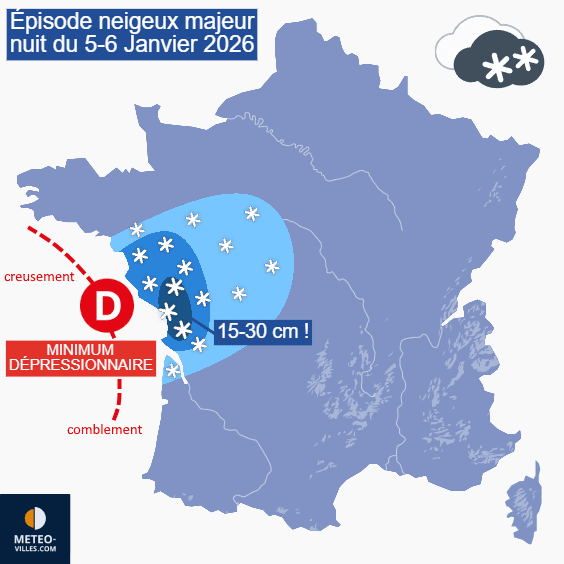 Si une grande partie nord-ouest de la France a été blanchie par la neige ce lundi 5 janvier 2026, les quantités ont été beaucoup plus importantes entre le sud des Pays de la Loire et la Charente-Maritime. En effet, un minimum dépressionnaire s'est creusé au sud de la Bretagne, causant le renforcement des précipitations sur la Loire-Atlantique (5 cm de neige à Nantes lundi soir) puis il a longé la Vendée et la Charente-Maritime dans la nuit. Son déplacement très lent a engendré des précipitations copieuses mais surtout durables, donnant 15 à 30 cm de neige entre sud-Vendée et Charente-Maritime !