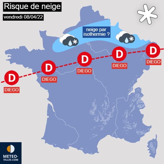 Prévisions du risque de neige lié à la tempête Diego le vendredi 8 avril 2022 - Météo Villes