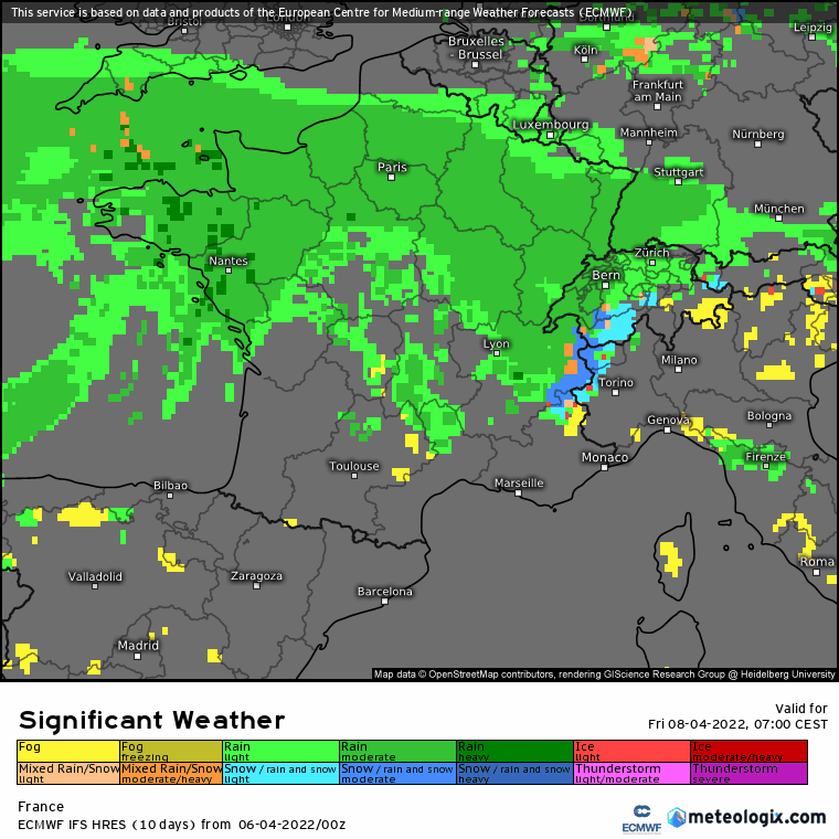 Précipitations le vendredi 8 avril 2022 (vert = pluie, orange = pluie/neige, bleu = neige) - via meteologix.com