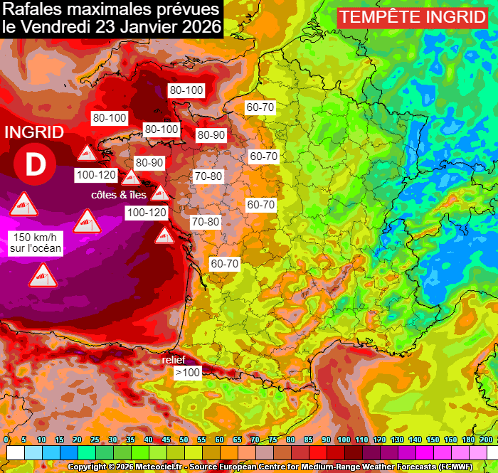 Une dépression tempétueuse se creusera rapidement au dessus des eaux de l'océan Atlantique ce jeudi 22 janvier 2026. Elle apportera du très mauvais temps sur le nord-ouest de la péninsule ibérique, raison pour laquelle les services météo espagnols ont baptisé cette tempête. Elle porte le nom d'Ingrid. Cette dernière atteindra des pressions inférieures à 960 hPa en son centre lorsqu'elle arrivera au large de la Bretagne vendredi 23 janvier 2026. Elle va ensuite se combler progressivement en remontant vers l'Irlande. Comme elle ne progressera pas vers l'est, son impact en France restera limité.