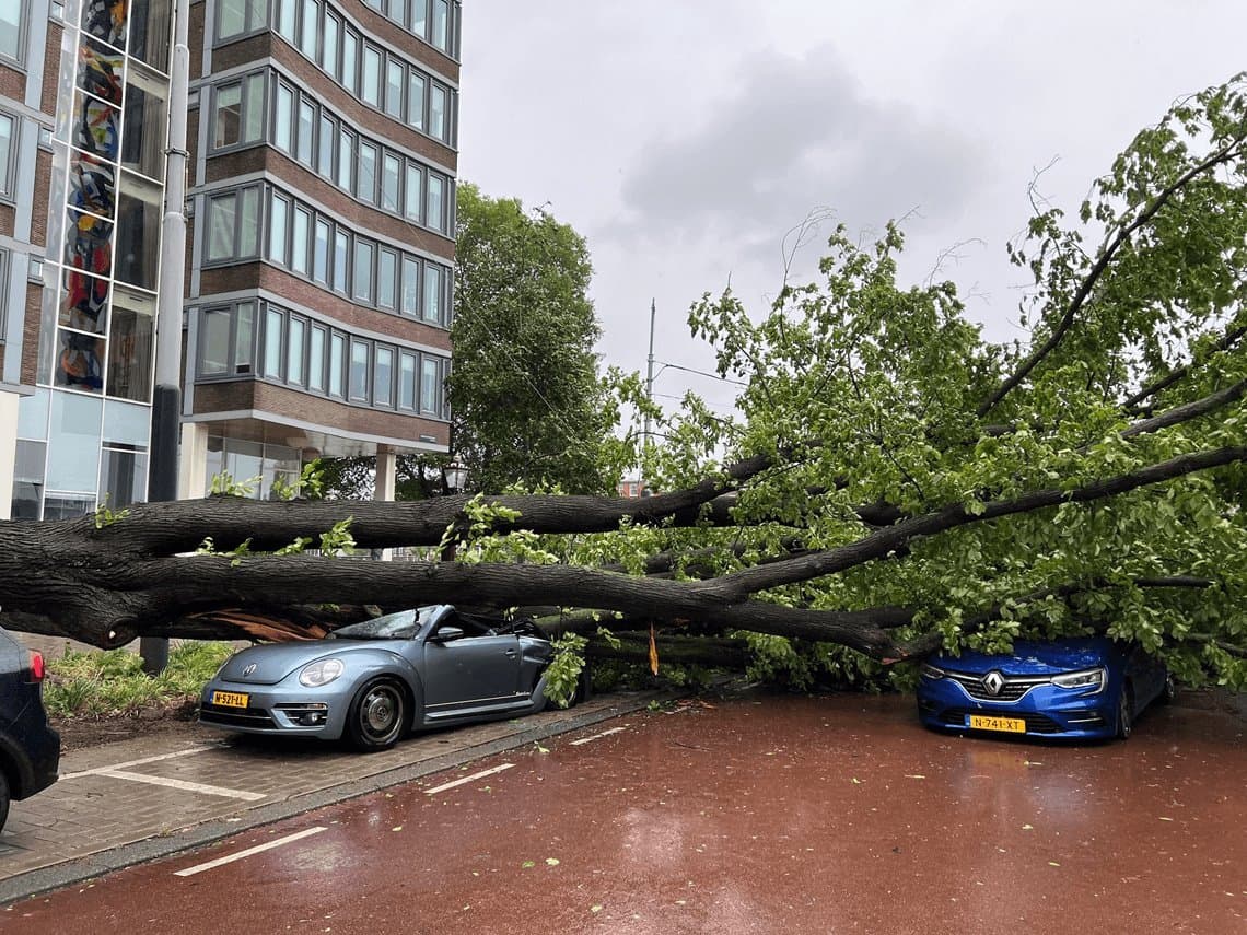 Arbre s'écrasant sur des voitures à Amsterdam ce mercredi 5 juillet 2023 - photo David E.Steves