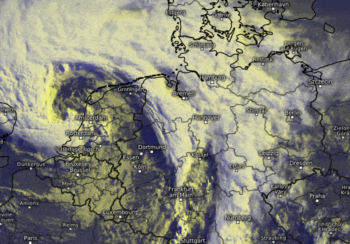 L'animation satellite ci-dessous restera sans doute dans les annales de la météorologie. Elle montre un enroulement dépressionnaire particulièrement impressionnant sur les Pays-Bas ce mercredi 5 juillet 2023. Particulièrement dynamique, cette dépression s'apperente plutôt aux tempêtes hivernales et s'est montrée particulièrement virulente au cours de la matinée de mercredi, tant sur les côtes que dans les terres.