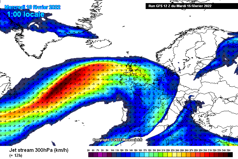 Le jet stream (ou courant jet en français) se nourrit de cet important contraste de masses d'air afin de s'accélérer aux portes de l'Europe. Sur l'animation ci-dessous, on constate que la vitesse des vents vers 9000 mètres d'altitude dépasse ponctuellement les 300 km/h sur les Îles Britanniques, notamment jusqu'au vendredi 18 février 2022. Un jet stream puissant favorise l'éclosion et le creusement rapide des dépressions, les rendant plus puissantes et plus dangereuses. Toutes les conditions sont donc réunies pour la formation de tempêtes.