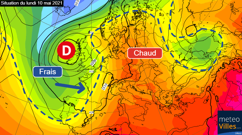 Situation atmosphérique sur l’Ouest de l’Europe ce lundi 10 mai 2021 – ECMWF, modifié par Météo-Villes