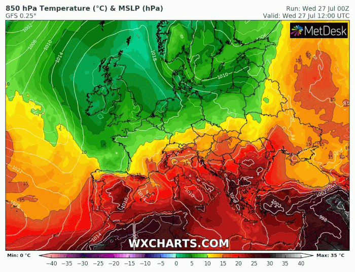 Masses d'air à 850 hPa (vers 1500m) du mercredi 27 juillet au lundi 8 août 2022 - via wxcharts.com