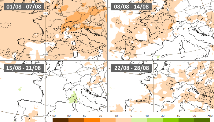 Anomalies pluviométriques hebdomadaires en août 2022 - modèle européen via ECMWF
