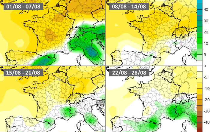 Projection de l'anomalie pluviométrique en août 2022 - Météo Villes