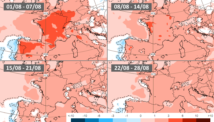 Anomalies thermiques hebdomadaires en août 2022 - modèle européen via ECMWF