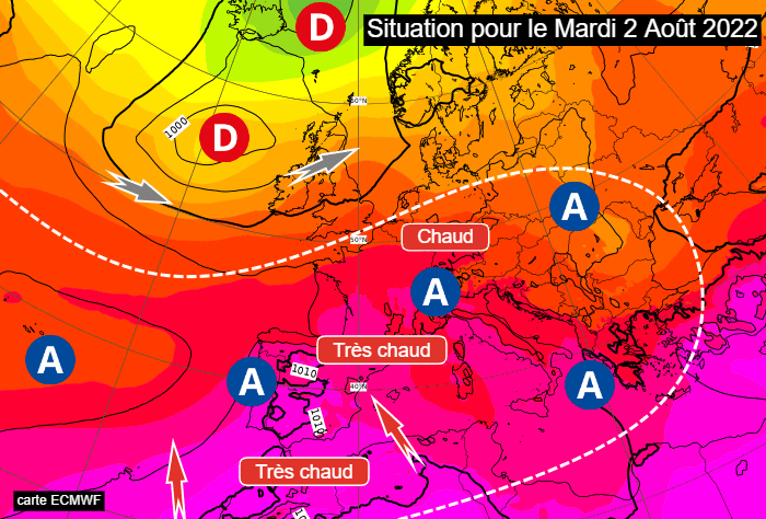 Situation à échelle continentale pour le mardi 2 août 2022 - via ECMWF