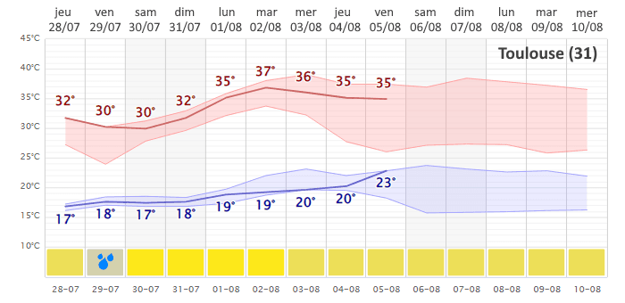 Quoiqu'il en soit, la menace d'un nouvel épisode de canicule possiblement durable est présente sur les régions du sud dès le début de la semaine prochaine. Les températures devraient franchir les 35°C de l'Aquitaine à la Provence dès lundi 1er août 2022 et pourront gagner plusieurs degrés les jours suivants, le tout avec des nuits devenant de plus en plus douces. Les prévisions pour Toulouse montrent au moins 5 jours à 35°C ou plus entre le 1er et le 5 août. À compter du week-end des 6 et 7 août, les projections deviennent plus floues avec des scénarios moins chauds mais également des scénarios durablement caniculaires.