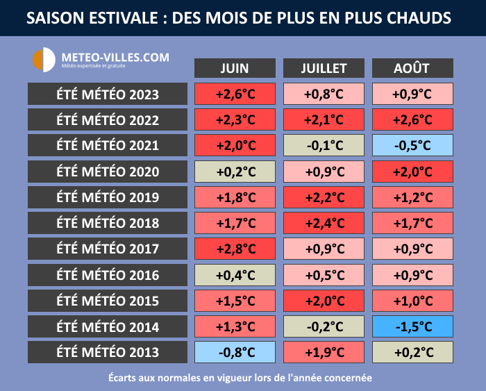 Anomalies thermiques mensuelles lors des été de 2013 à 2023 - Météo Villes