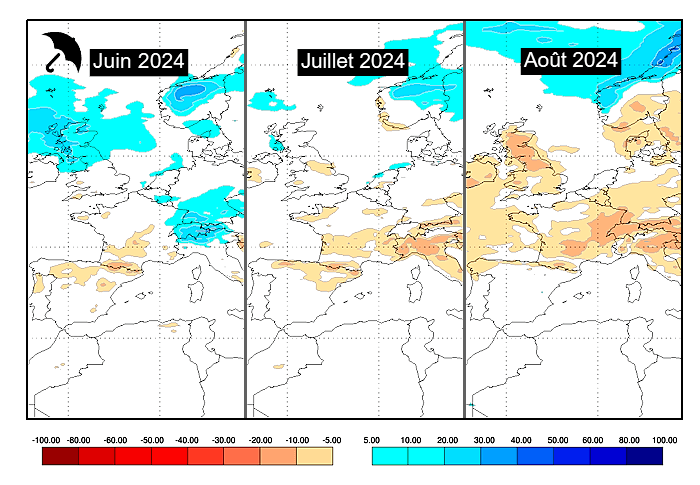 Anomalies pluviométriques modélisées durant l'été 2024 selon le modèle européen - via ECMWF