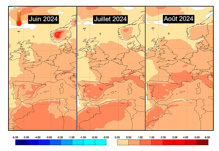 Anomalies thermiques modélisées durant l'été 2024 selon le modèle européen - via ECMWF