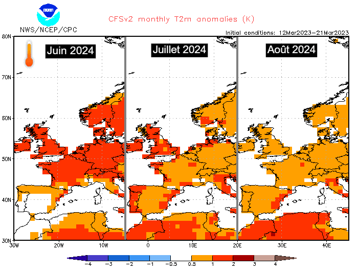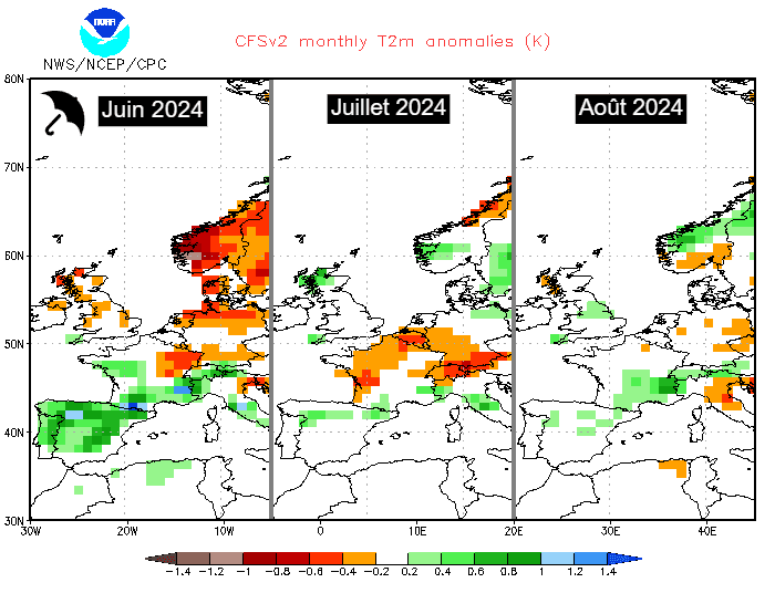 Le modèle américain tend à suivre les projections de son homologue européen. Il envisage également des températures supérieures à la normale lors des trois mois de l'été 2024. Toutefois, c'est au cours du mois de juin 2024 qu'il projette la plus forte anomalie chaude avec des valeurs souvent 1 à 2°C au dessus des normales. Les valeurs seraient plutôt 1°C au dessus de la normale en juillet et en août avec une chaleur un peu moins excessive. Quoiqu'il en soit, le bilan de l'été serait chaud si ces projections s'avèrent exactes.