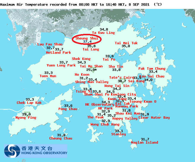 Températures maximales relevées ce 8 septembre 2021 à Hong-Kong – Hong Kong Observatory