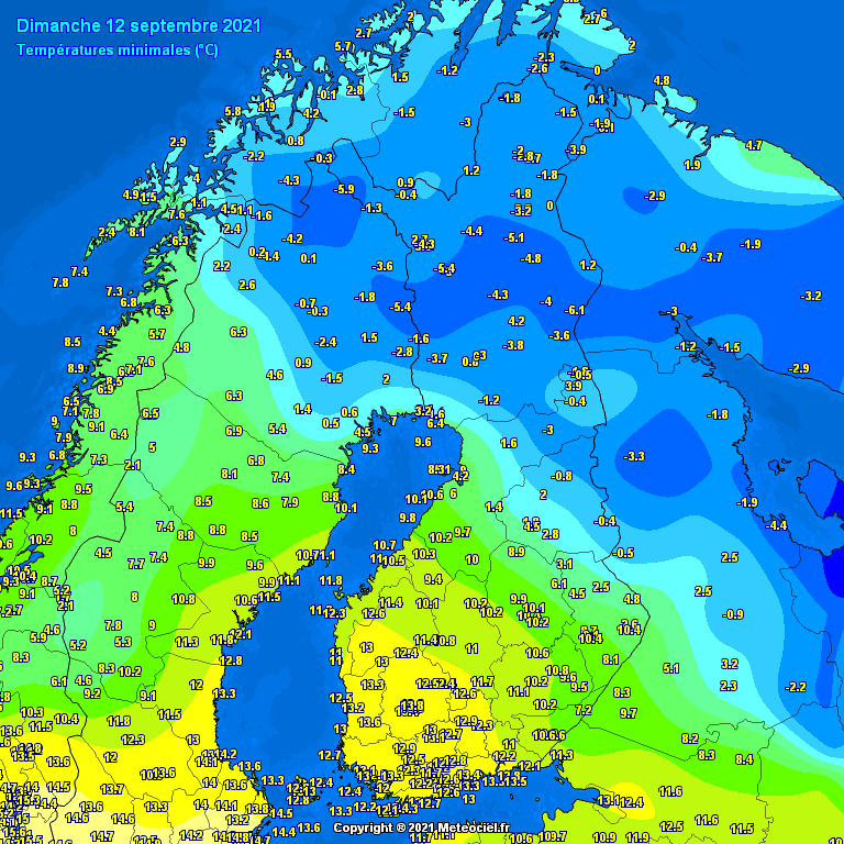 Températures minimales relevés sur le Nord de la Scandinavie ce 12 septembre 2021 – Via meteociel.fr