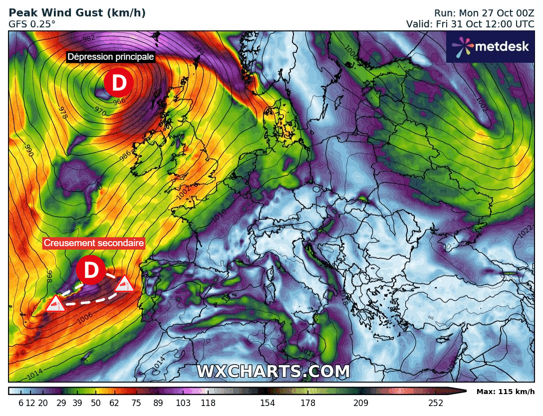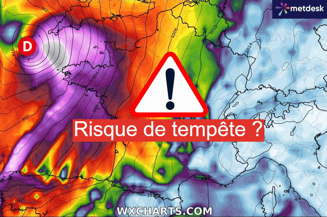 En effet, c'est en fin de semaine, surtout entre vendredi et samedi, que le courant jet s'orientera le plus franchement vers le pays. Ainsi, si la zone dépressionnaire principale devrait stagner entre l'Islande et les îles britanniques, des creux secondaires pourront se former le long de ce courant jet et potentiellement impacter la France entre le 31 octobre et le 1er novembre, induisant de ce fait un risque de coup de vent ou de tempête sur une partie du pays.