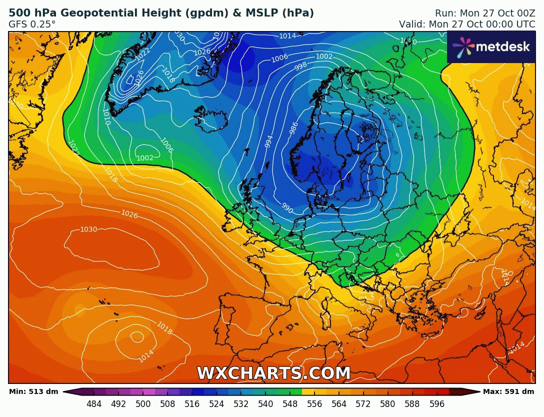 Animation des géopotentiels sur l'Europe du 27 octobre au 2 novembre 2025 – Modèle GFS via WX CHARTS
