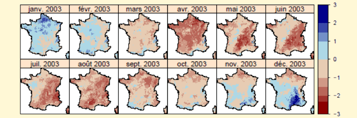 Indice d'humidité des sols en France de janvier à décembre 2003 - via Météo France