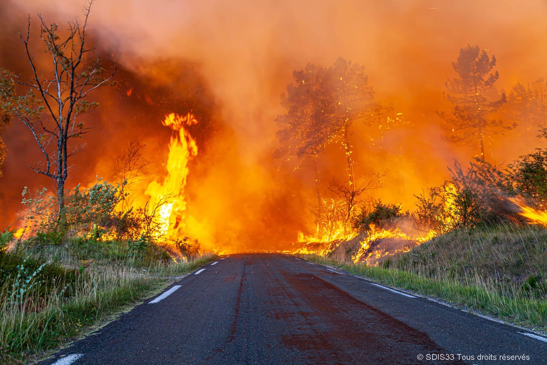 L'incendie de Landiras (Gironde) traversant les routes le 17 juillet 2022 - photo SDIS33
