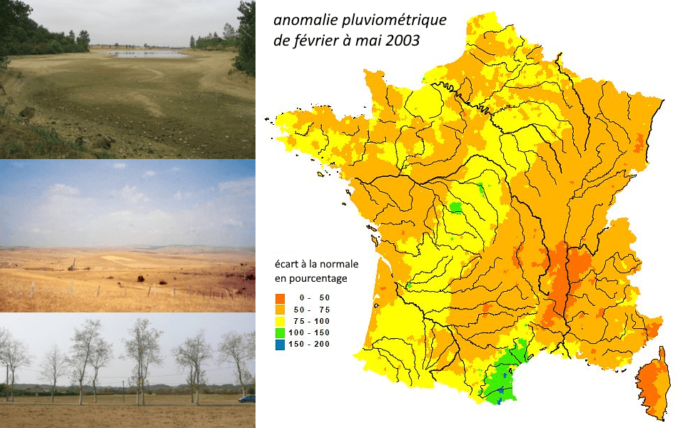 2003 a également marqué les esprits, notamment en raison de la canicule hautement meurtrière survenue au cours du mois d'août. Si l'on retient notamment la chaleur, la sécheresse avait également fait la une et posé de gros problèmes en France durant les trois quarts de l'année. Le déficit pluviométrique apparaît surtout dès le mois de février puis s'accentue au cours d'un mois de mars très sec. S'en suivront six mois consécutifs avec un déficit proche de 25% d'avril à septembre 2003, permettant à la sécheresse de s'installer et s'accentuer dans la durée.