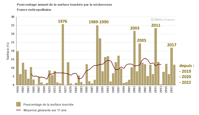En France, l'occurrence des sécheresses a sensiblement augmenté depuis la fin des années 1980. La sécheresse la plus marquante de l'ère moderne reste cependant celle de l'année 1976, restée ancrée dans la mémoire collective. La sécheresse durable des années 1989 et 1990 a atteint une intensité presque aussi importante. Au XXème siècle, la sécheresse de 2003 avait marqué les esprits. Plus récemment, la sécheresse du printemps 2011 avait atteint une ampleur exceptionnelle. On peut ajouter à cette liste les récentes sécheresses de 2019, 2020 et donc 2022.