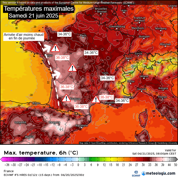 Températures maximales attendues sur la France entre le 20 et le 21 juin 2025 – Modèle ECMWF-HRES via meteologix