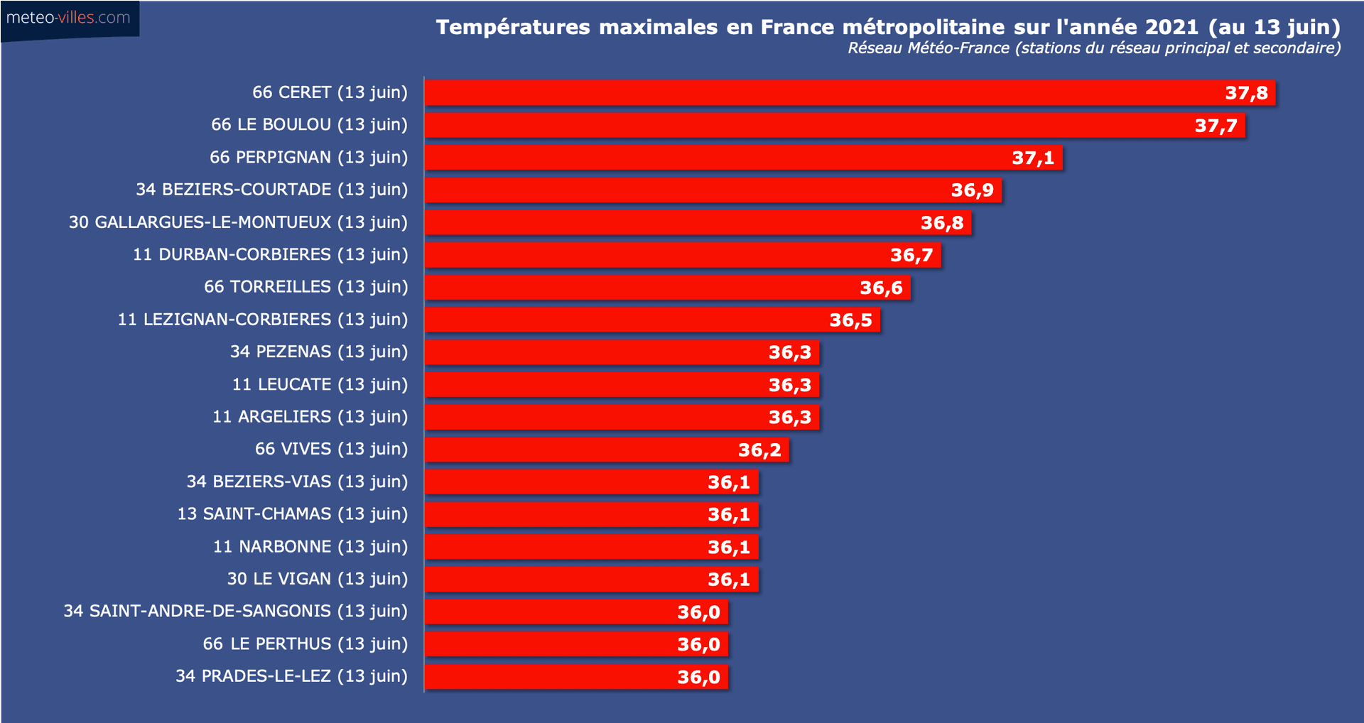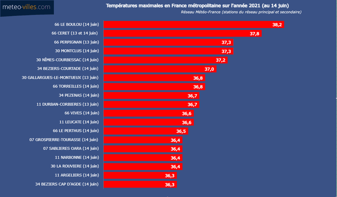 Cette journée du 13 juin fut provisoirement la plus chaude de cette année 2021, et les températures maximales observées sont également les plus élevées de l'année. Le département des Pyrénées-Orientales truste le haut du classement avec 37.8°C à Céret et 37.7°C au Boulou. Notons également les 37.1°C sur l'aéroport de Perpignan-Rivesaltes qui se place au second rang des valeurs les plus élevées jamais enregistrées sur cette station en juin (ouverte en 1924), derrière l'invraisemblable après-midi du 28 juin 2019 (42.4°C).