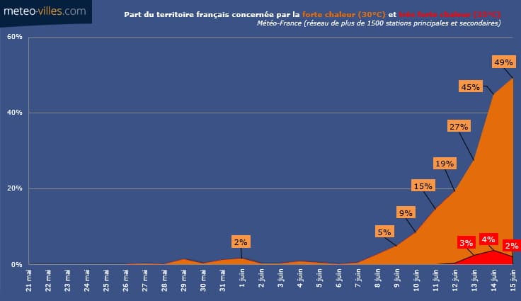 Lors de la journée du 13 juin, 27% des stations météorologiques du territoire ont dépassé le seuil de chaleur (30°C) principalement sur le pourtour Méditerranéen et dans le Sud-Ouest, et 3% ont atteint les 35°C (seuil de très forte chaleur).