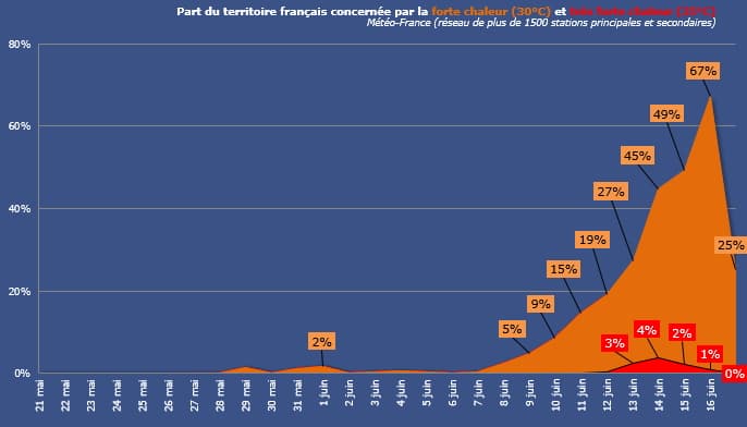 Ce lundi 14 juin, celui-ci a été atteint sur 45% des stations du territoire, notamment entre la Méditerranée, le Sud-Ouest, le Centre et les Pays de la Loire. Le seuil de très fortes chaleurs (35°C) à quant à lui été atteint sur 4% des stations du réseau Météo-France.